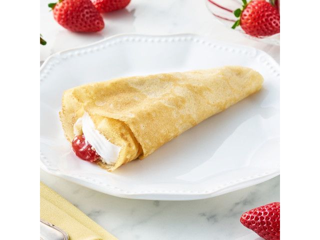 フランス北西部のブルターニュ地方のガレット生地をクレープ状に食べやすい形で作りました。風味の良い北海道クリームチーズを使ったチーズホイップクリームに、濃厚チーズ風ソースを合わせ、甘酸っぱい苺ソースとサクサククランブルをトッピング。デザートにアレンジした「プチ・ガレット」で、フランス気分を感じられる一品です。 JANコード4580592000597 カロリー:238kcal