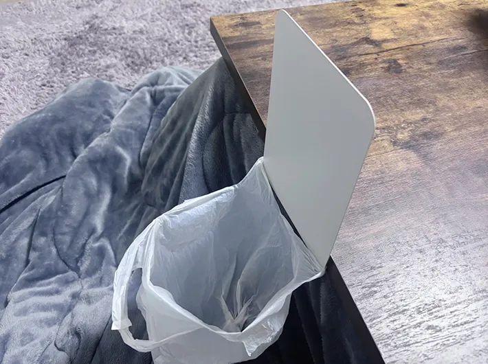 挟んだブックエンドに小さなビニール袋を引っ掛けるだけで、簡易ゴミ入れの完成です。