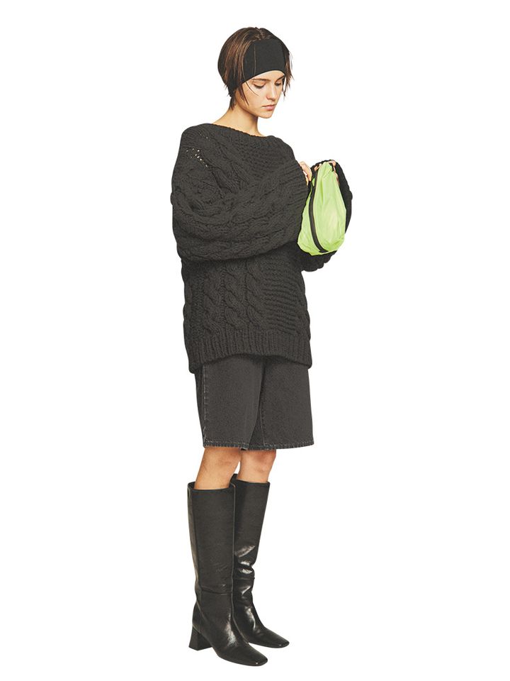 ぶかっと着られるローゲージのビッグニット。手編みならではの複雑な編み模様がほかにはない立体感に。やや横長に開いたえりぐりとワイドスリーブで、力みのとれた存在感のある見た目を演出。部分的に編み方を変えることで、ゆるサイズでもメリハリよく。