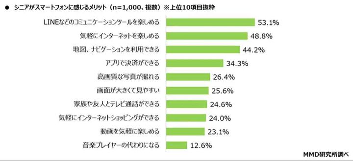 スマホ利用のメリットとして半数以上の人が「LINEなどのコミュニケーションツールを楽しめる」ことを挙げており、文字入力や写真送付を通じて大切な人と繋がることが、シニア層にとっても生活の一部として定着しています。