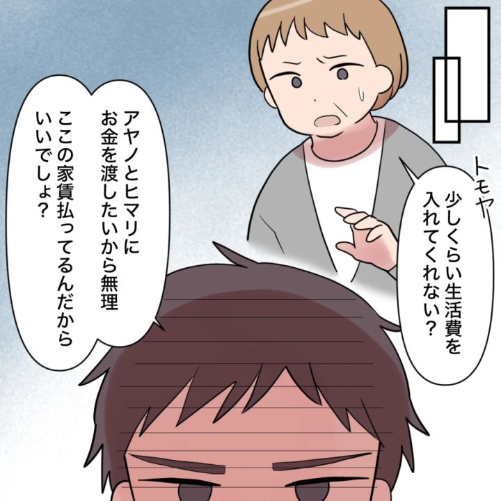 アヤノさんと離婚したトモヤさんは、ナオキさんに言われた通り義母とキョウカさんの家賃を負担するしかありませんでした。どんなにアヤノさんに必要とされているときにでも義母とキョウカさんの言いなりになって最優先し、家族を蔑ろにしてきたトモヤさんですが、離婚後はどれだけ義母が生活費の援助をお願いしても「アヤノとヒマリにお金を渡したいから無理」ときっぱり断るようになりました。