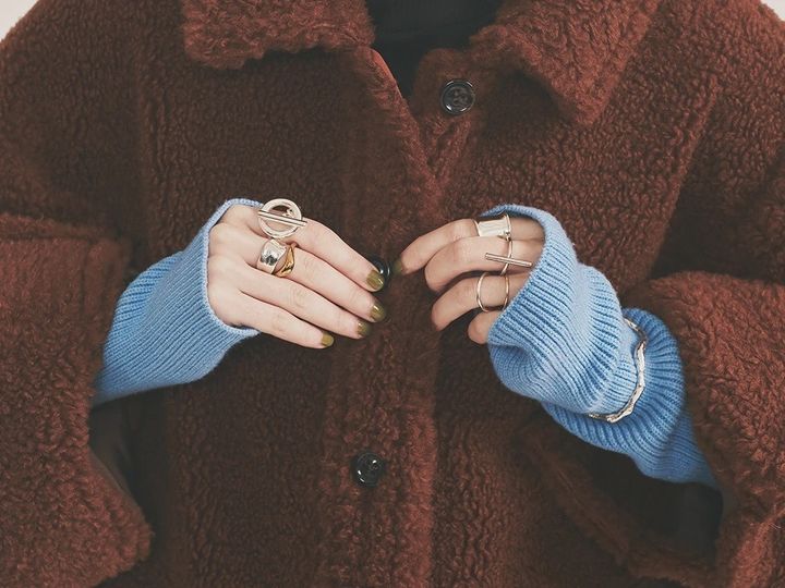 リッチなブラウンのそでに仕込んだ、涼やかなアイスブルー。存在感あるカラーレイヤードにも埋もれない、大ぶりアクセがスパイスに。色の印象に傾きすぎないよう、シルバーで統一し光沢感で勝負。