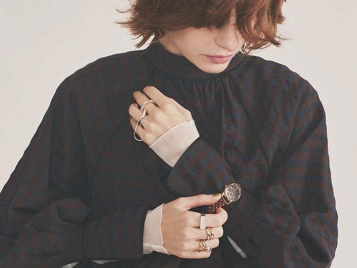 暗色の柄ブラウスにアクセと重ね着でメリハリを上乗せ。直線的な細かいチェック柄に対して、太リングやアーティなモチーフで目を引くギャップを演出。肌なじみのいい透け素材のインナーをのぞかせ、奥行きを加えながら強弱のバランスを調整。