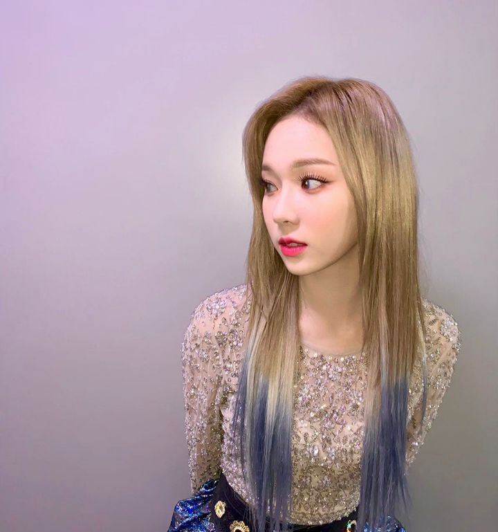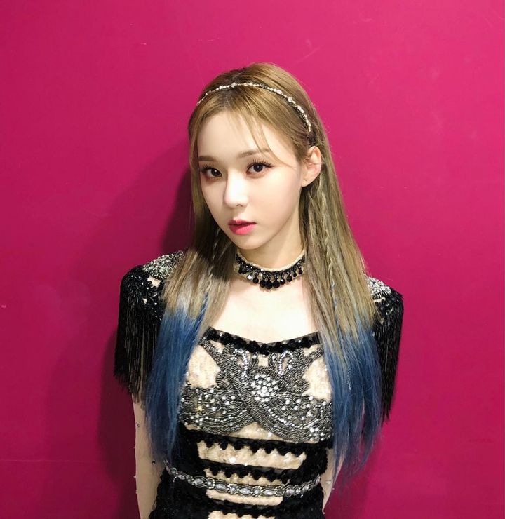 aespaがアンバサダーを務める「ジバンシィ」のキャミドレスを着たウィンター。金髪のエクステをつけたグラデーションヘアと濃いめのアイメイクが相まって色気が倍増。