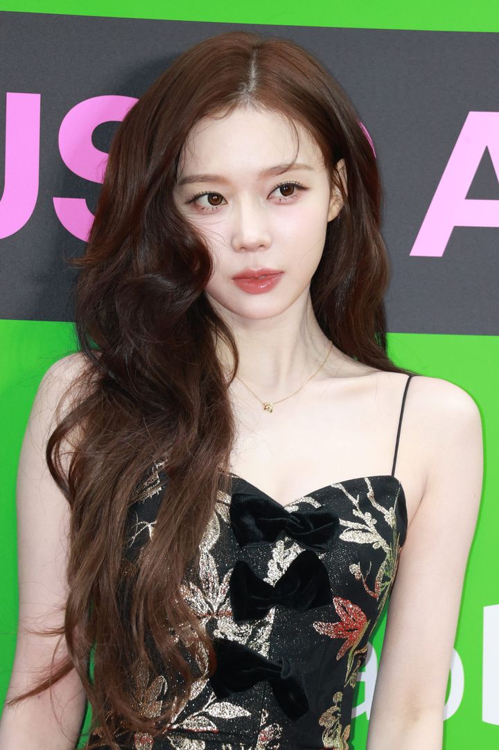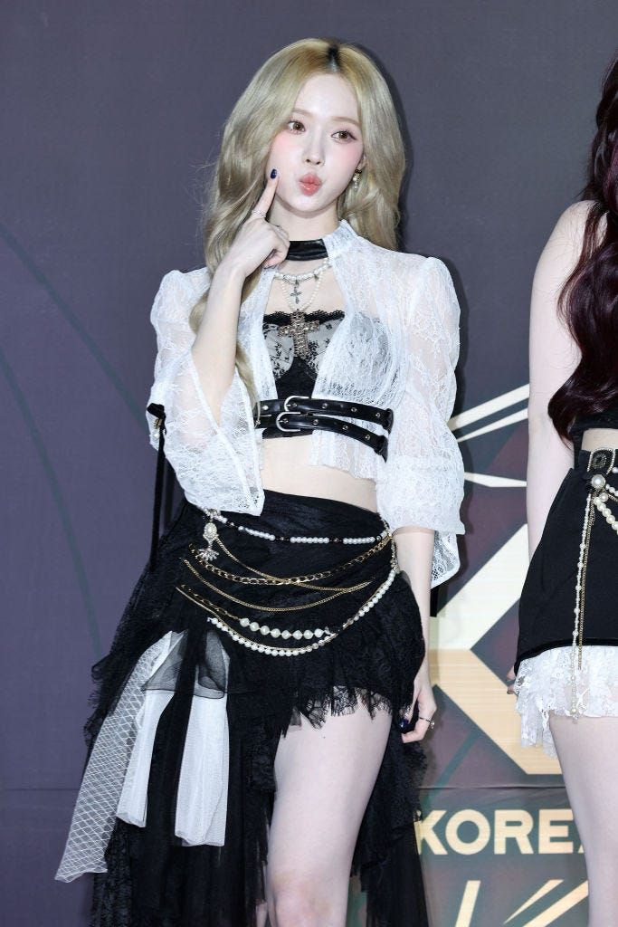 「2024 Korea Grand Music Awards」にて。金髪ロングを外巻きにしたゴージャスなヘアスタイルと、セクシーな衣装で会場を魅了。メイクはピーチベージュカラーのリップ&チークでほんのり甘さをプラス♡
