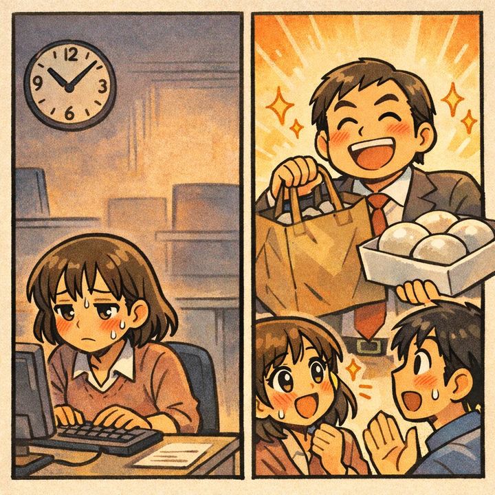 「みんな、遅くまでお疲れ様!有名店の高級な大福を買ってきたよ。これを食べて、もうひと踏ん張り頑張ろうじゃないか!」