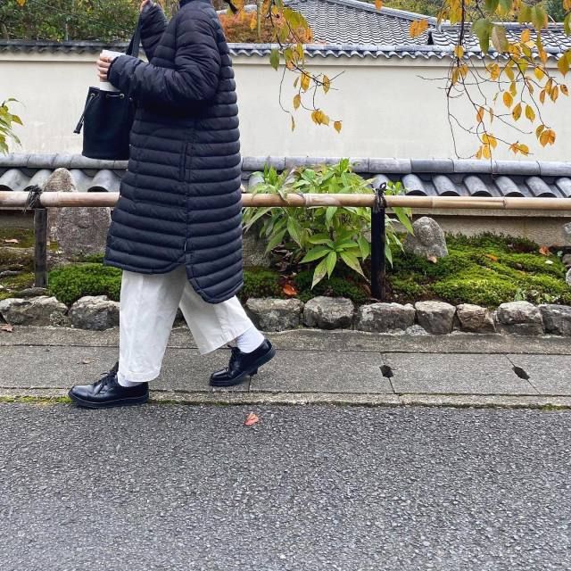 黒コート×白パンツのコーデ