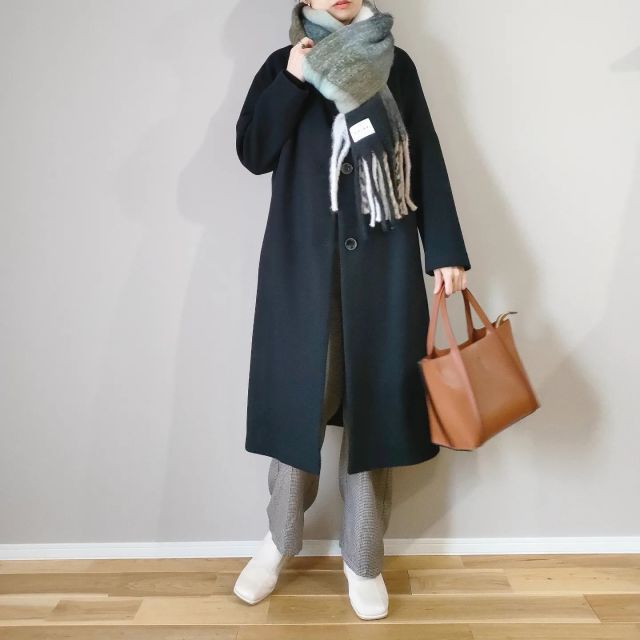 黒コート×チェック柄ストール・マフラーのコーデ