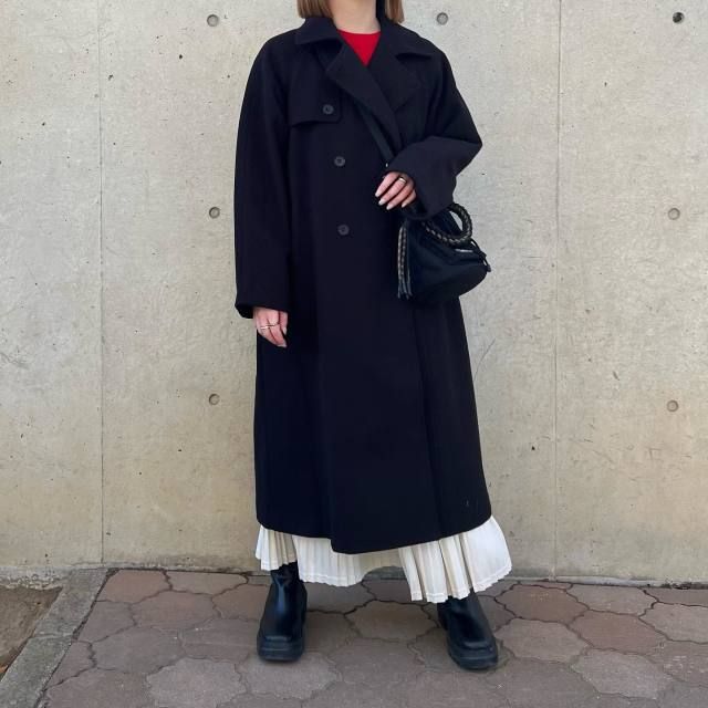 黒コート×ロング丈プリーツスカートのコーデ