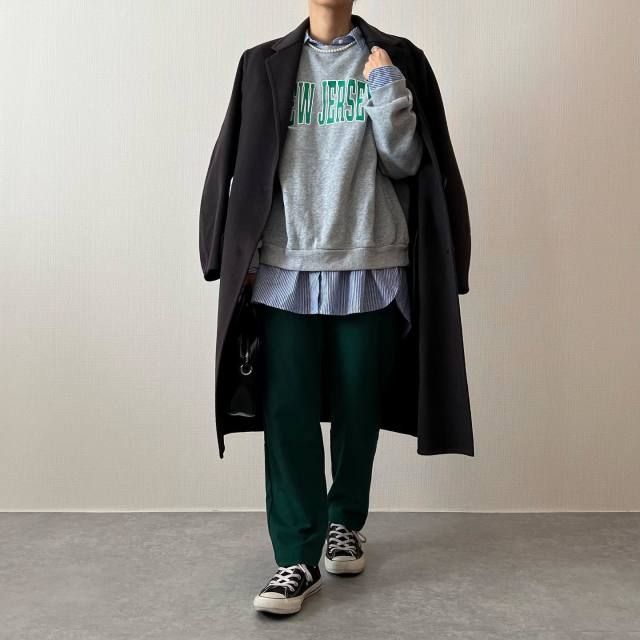 黒コート×ロゴスウェットのコーデ
