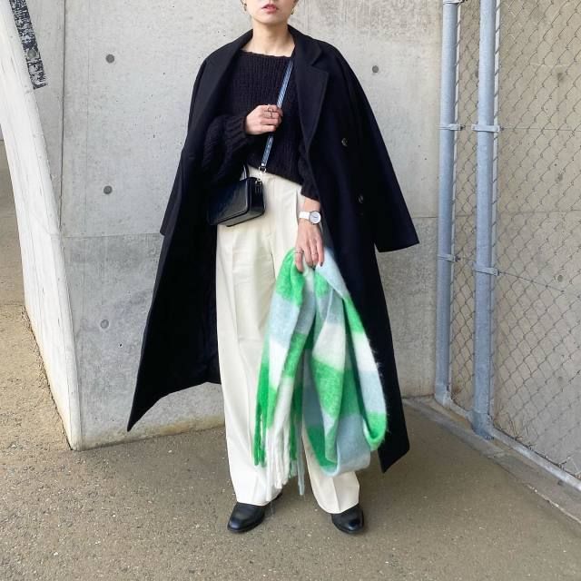 黒コートは「チェック柄ストール・マフラー」がもっとも似合うアウター。派手色のチェック柄でも、シックなコートのおかげで悪目立ちせず、コーデは落ち着いた雰囲気に。