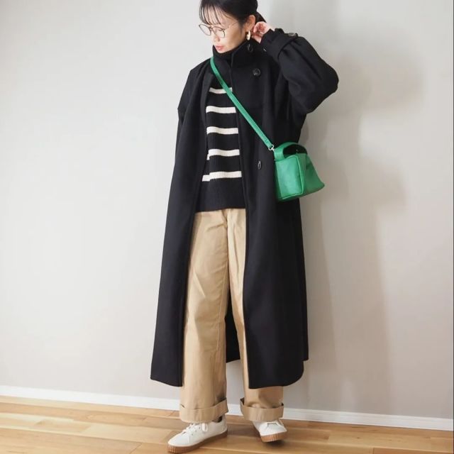 黒コートは「モノトーンカラーのボーダー柄トップス」にぴったりマッチ。コートとインナーの色が馴染むことで、全体がしっくりまとまります。