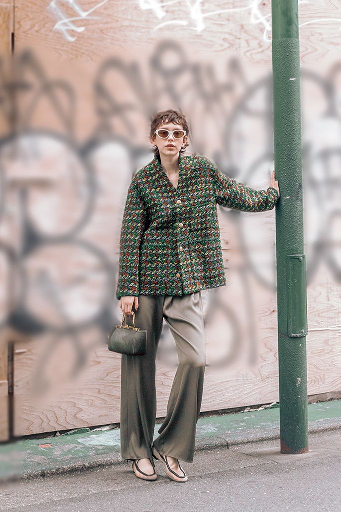 味のあるジャケットを主役にするときは、とろみパンツで全体をすっきりと。同系色でまとめることにより、くすんだ色合いでもどことなくスタイリッシュ。