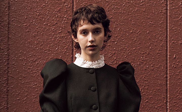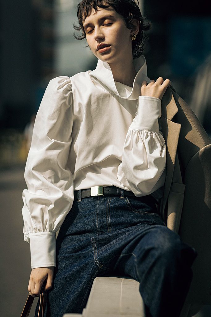 ひかえめなパフスリーブが、正統派な装いの力みを抜くポイント。後ろ側にはボタンを配しているため、前後逆に着てみたり、ネックラインを折ったり、簡単に着方をアレンジできる。