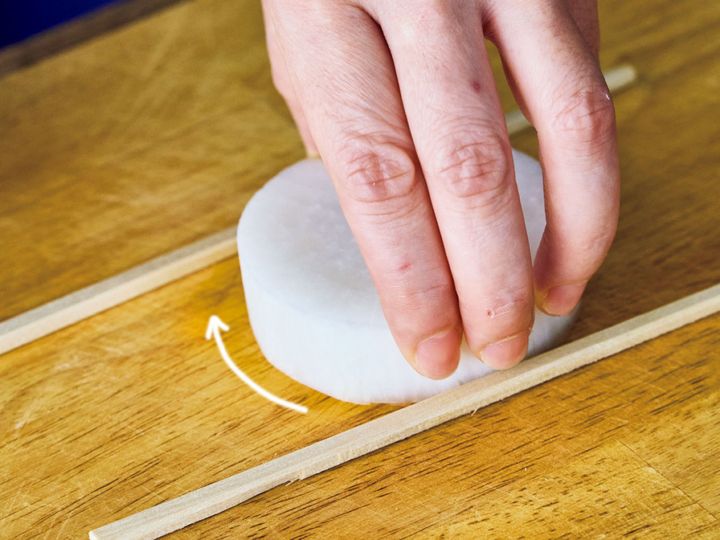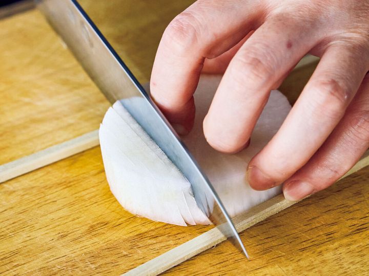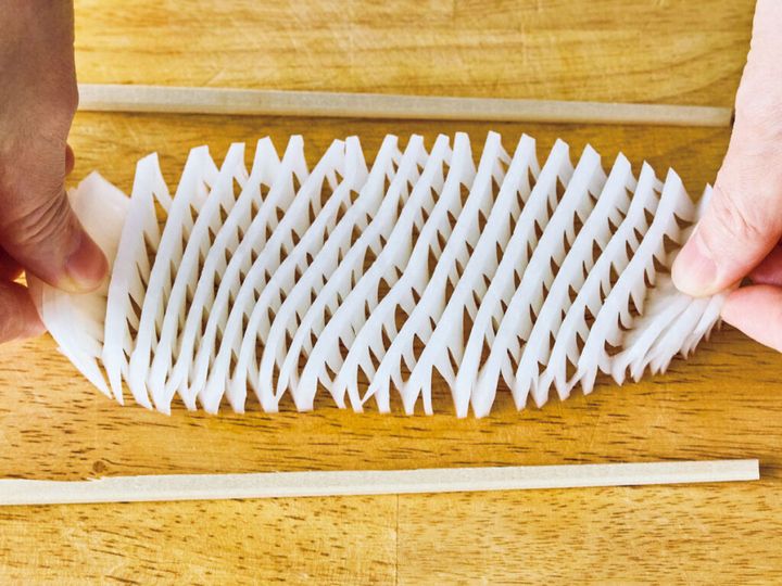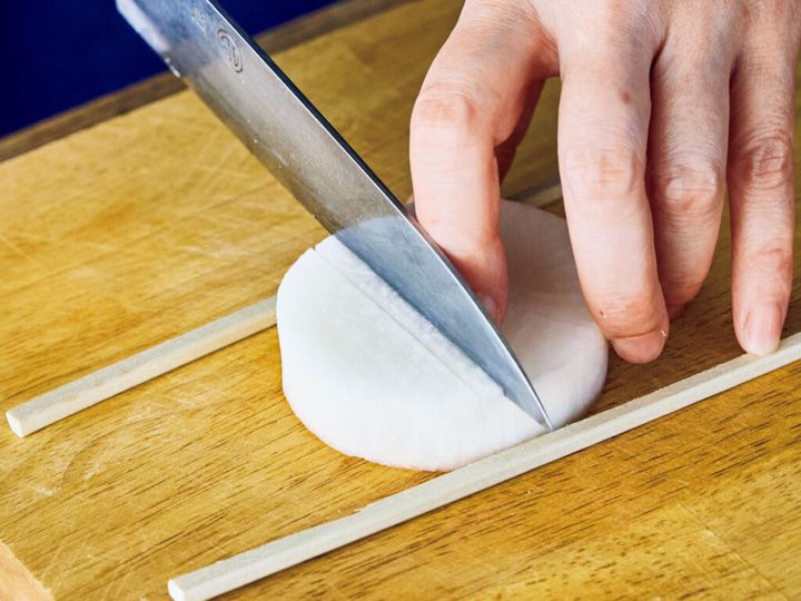 大根は幅2cmに切って皮をむく。まな板にのせて割り箸を上下に1本ずつ置き、2mm間隔で切り込みを入れる。