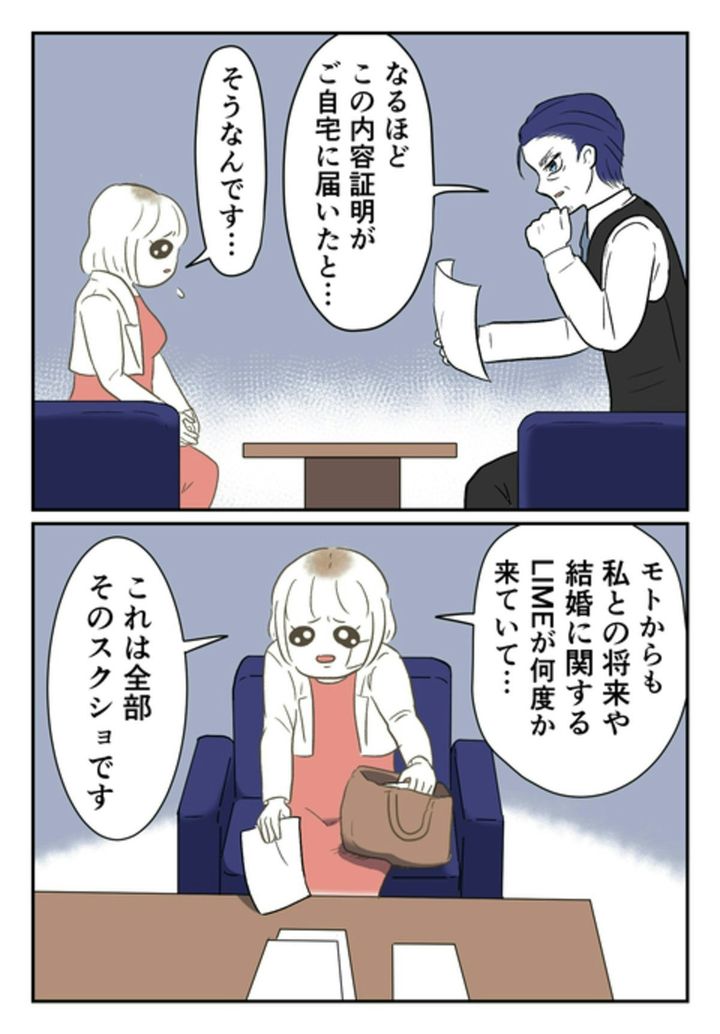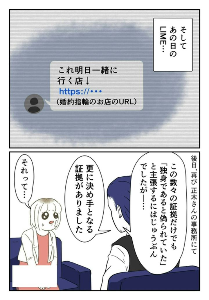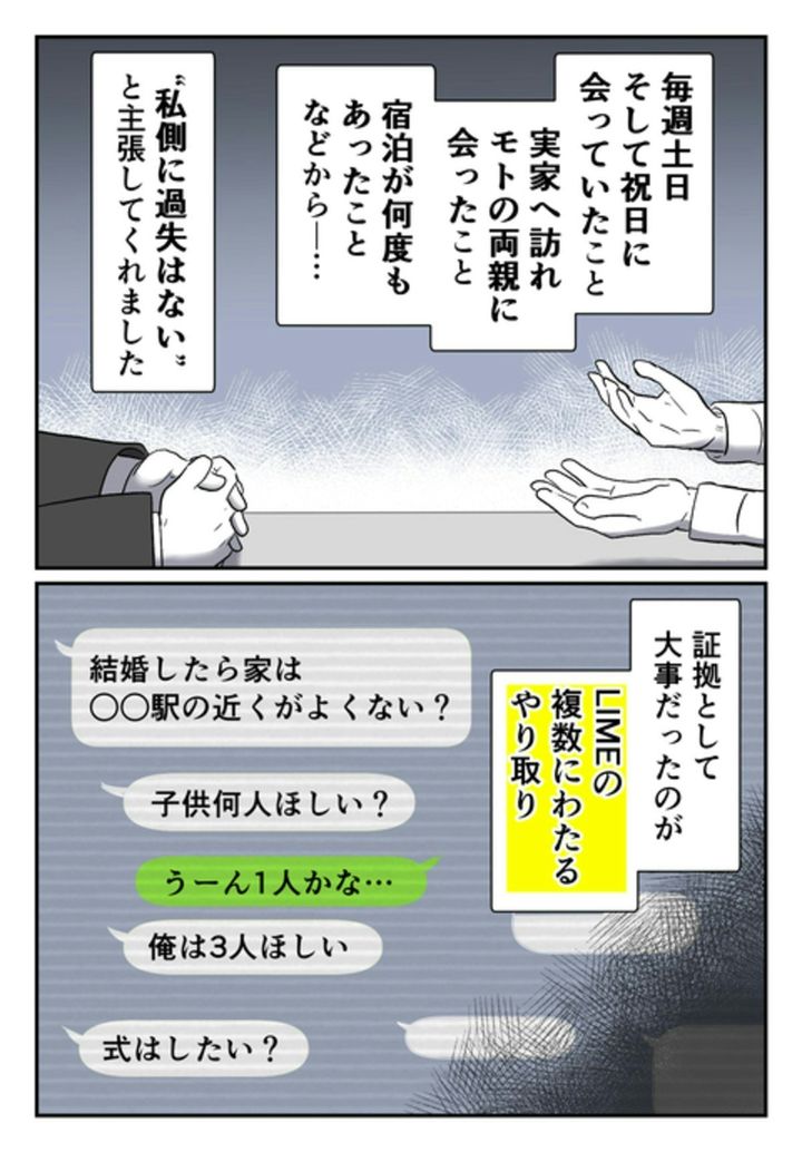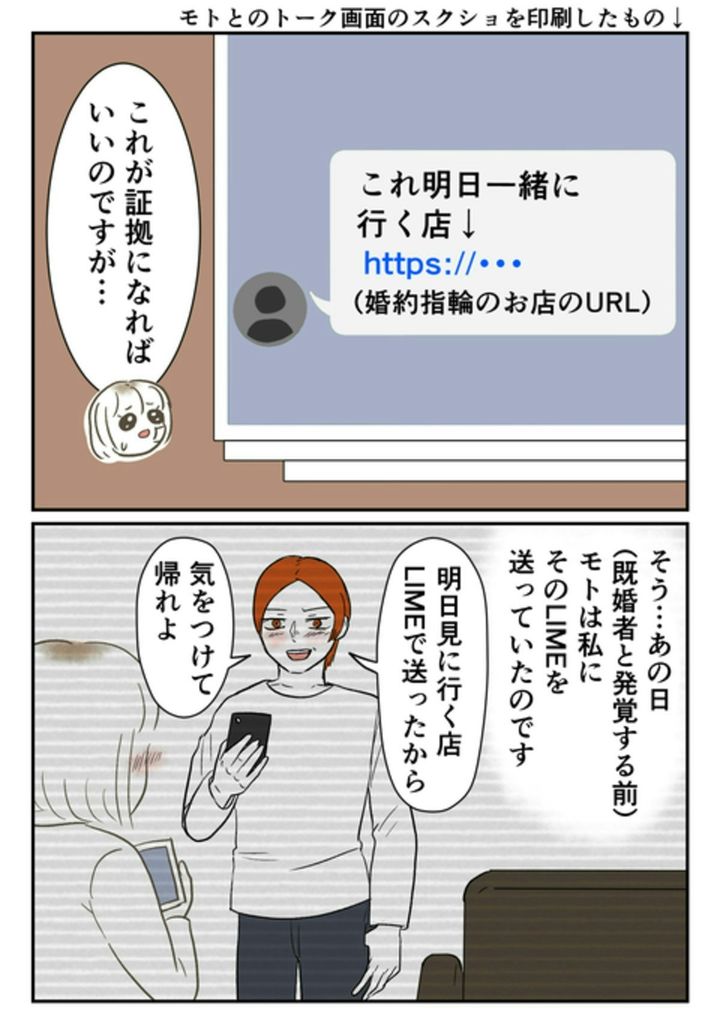 モトは、今の妻と離婚が成立していないのに、尾持さんに求婚していたのです。プロポーズをし、婚約指輪を買いに行く約束をしていたあの日のやりとりが、重要な証拠として役立ちました。