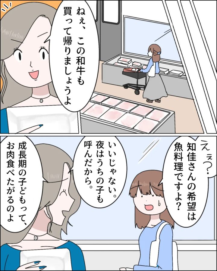 「ねぇ、この和牛も買って帰りましょうよ」と高級和牛のパックを持ってくる麻里さんに、「えぇ?知佳さんの希望は魚料理ですよ?」と私が答えると、「いいじゃない。夜はうちの子も呼んだから。成長期の子どもって、お肉食べたがるのよ」平然とそう話す麻里さん。