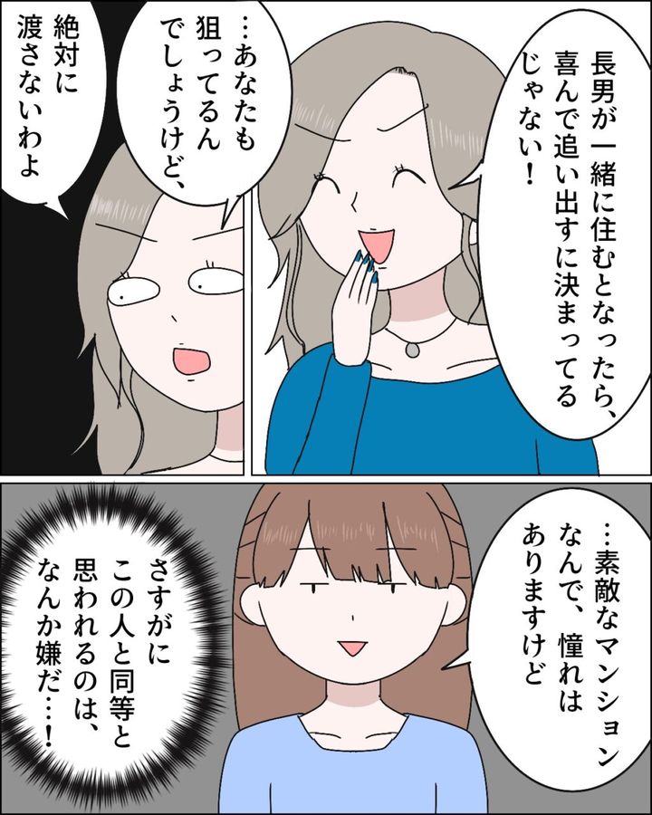 「長男が一緒に住むとなったら、喜んで追い出すに決まってるじゃない!」と完全に決めつけて話を進める麻里さんは、「・・あなたも狙ってるんでしょうけど、絶対に渡さないわよ」と詰め寄ってきました。「・・素敵なマンションなんで、憧れはありますけど」と答えつつ、「さすがにこの人と同等と思われるのはなんか嫌だ・・!」と心の中で叫んだのでした。
