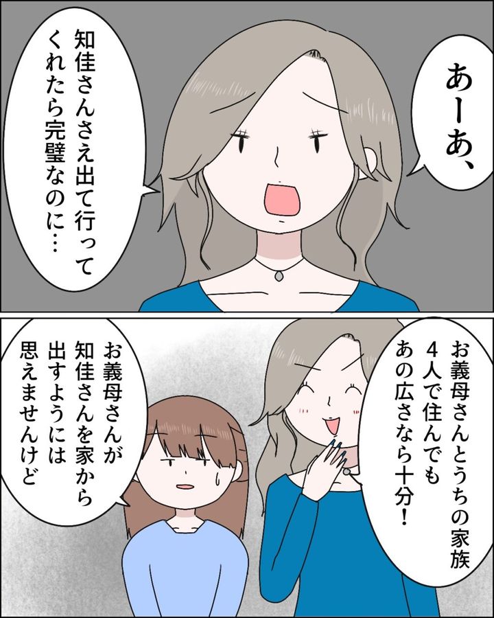 すると、「あーあ、知佳さんさへ出て行ってくれたら完璧なのに・・お義母さんとうちの家族4人で住んでもあの広さなら十分!」とすでにあのマンションに家族で住んでいることをイメージしているような麻里さん。「お義母さんが知佳さんを家から出すようには思えませんけど」私が呆れてそう言うと、