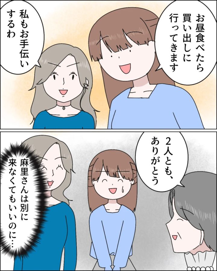 その後、「お昼食べたら買い出しに行ってきます」義母にそう言うと、「私もお手伝いするわ」としゃしゃり出る麻里さん。「2人ともありがとう」と義母は笑顔で言うけれど、「麻里さんは別に来なくてもいいのに・・」と心の中で思っていました。