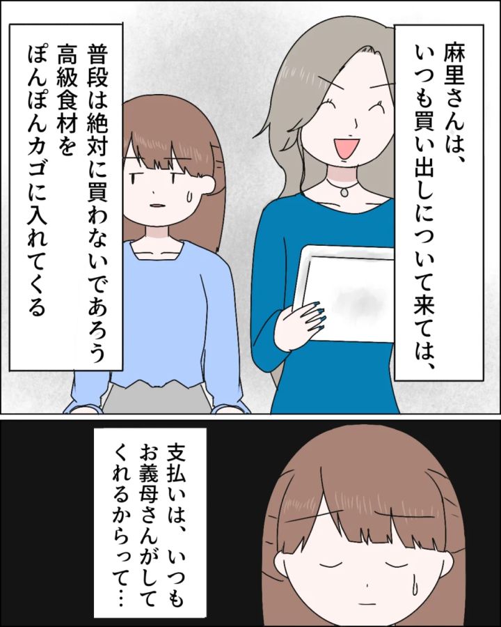 料理をしない麻里さんまで買い出しについて来て、和牛などの作る予定のない高級食材をぽんぽんカゴに入れる麻里さんに「お義母さんが払ってくるれからって・・」とうんざりするユカさん。義母のマンションに家族で住むと野望を剥き出しにする麻里さんとは、確かに同等と思われたくありませんよね。