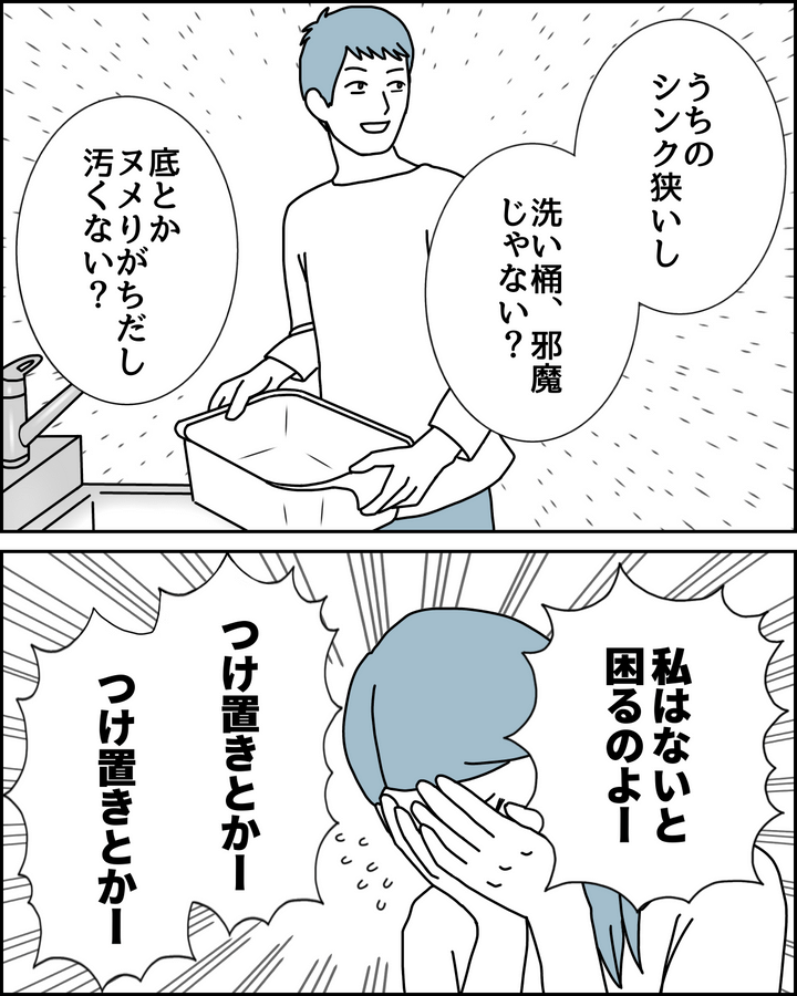 夫「うちのシンク狭いし洗い桶、邪魔じゃない? 底とかヌメりがちだし汚くない?」