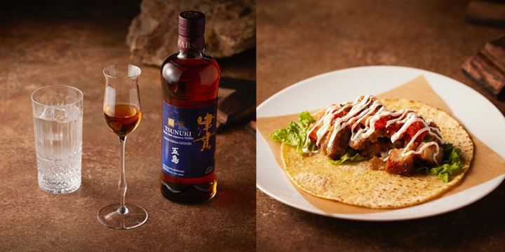 フードメニューは、「津貫 五島」と同じく鹿児島の豊かな風土が育んだ食材が贅沢に使用されています。じっくり火入れした鹿児島黒豚のコンフィを、鹿児島の麦味噌をベースにしたコンディマンで和えてトルティーヤで包み、バーフードらしく片手で気軽に楽しめるタコススタイルに。唐辛子の代わりに九州ならではの柚子胡椒を効かせたサルサソースとまろやかなサワークリームを使用し、カジュアルながらも奥行きのある味わいに仕上がっているそうです。麦味噌の柔らかな甘みと黒豚の上質な脂の旨味はウイスキーの香りと相性が良く、ペアリングならではの一体感を堪能できるといいます。