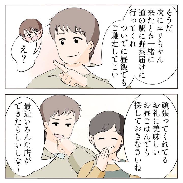 すると父は思いついたように「次にユリちゃんが来たとき一緒に道の駅に野菜届けに行ってくれ、ついでに昼飯でもご馳走してこい」と言いました。突然の提案に、俺は「え?」と驚きます。「頑張ってくれてるお礼に美味しいお昼ごはんでも探しておきなさいね」「最近いろんな店ができたらしいしな~」・・・この2人、絶対に楽しんでる。