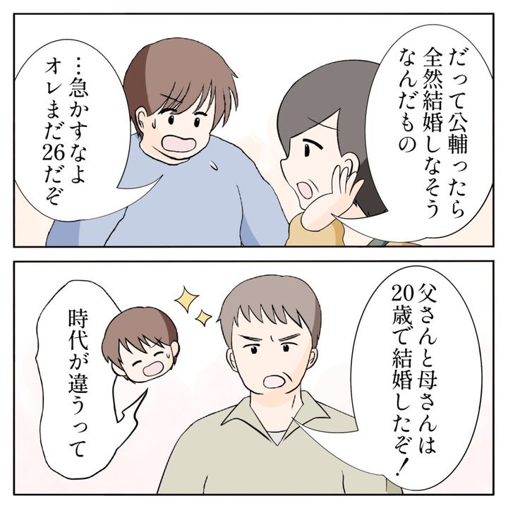 「公輔ったら全然結婚しなさそうなんだもの」と困ったように言う母に、俺は「・・・急かすなよ、俺まだ26だぞ」と返しました。すると今度は父が「父さんと母さんは20歳で結婚したぞ!」と得意げに口を挟んできます。俺は「時代が違うって」と盛り上がる2人をなだめました。