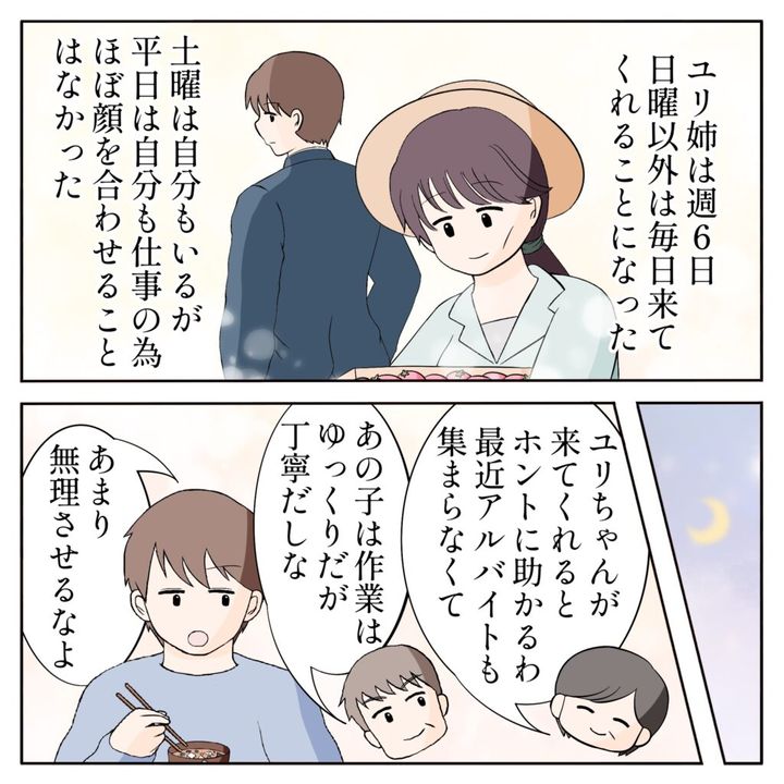 ユリ姉は、日曜以外は毎日来てくれることに。ただ、俺は平日は本業があるのでほとんど顔を合わせることはありませんでした。両親はユリ姉が来てくれて相当助かっているみたいで、「ユリちゃんが来てくれるとホントに助かるわ」「あの子は作業ゆっくりだが丁寧だしな」と彼女の仕事ぶりをこれでもかというほど褒めちぎっていました。