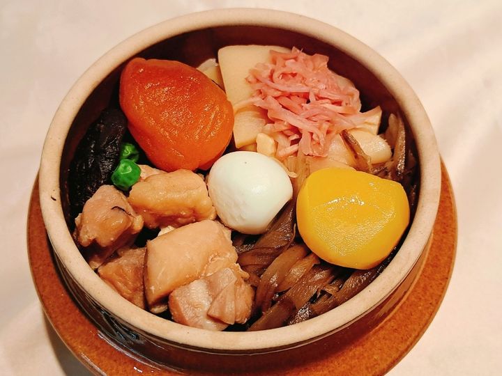 厳選した数種類の醤油をブレンドし、昆布の出汁とともに炊き上げたコシヒカリの茶めしの上に、色彩豊かな9種類の具材たち。