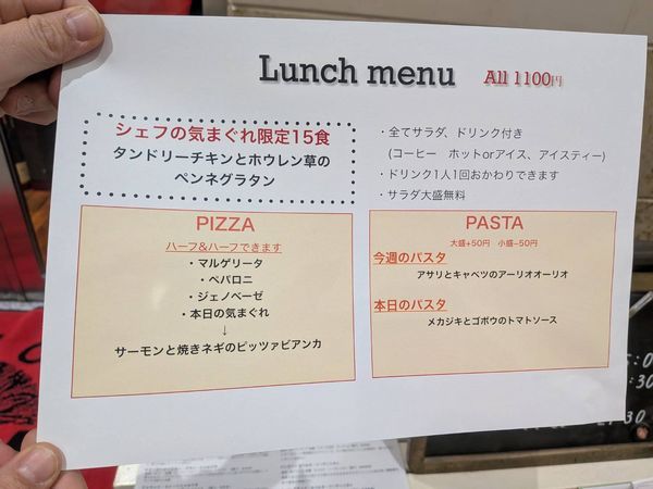 ランチメニューはALL1,100円で、メイン・サラダ・ドリンク付き。