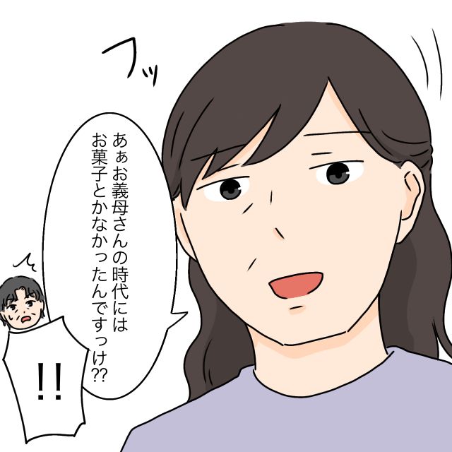 「そんな油まみれのお菓子は体に悪い」と義祖母に批判された義母は「これは健康を考慮した子ども用スナックなんです!」と反論し、「あぁ、お義母さんの時代にはお菓子とかなかったんですけ??」と嫌味たっぷりに言うと、義祖母は悔しそうな表情。