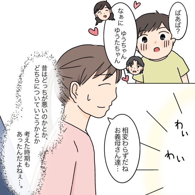 すると、大人たちの気まずい空気をよそにゆうたが「ばあば?」と甘えた声で呼びかけました。義母も義祖母も自分が呼ばれたと思い「なぁにゆうちゃん」「なぁにゆうたちゃん」とさっきまでの刺々しい声とはうってかわって優しい声で答えます。ゆうたのおかげで場が和みホッとしながら、私は「相変わらずだね、お義母さん達・・」と太郎と苦笑いしながら、「昔はどっちが悪いのかとか、どちらについていこうかとか考えた時期もあったんだよねぇ・・」と結婚当初のことを思い出しました。