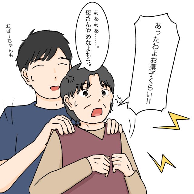 すぐさま「あったわよお菓子くらい!!」と声を荒げる義祖母を、太郎が「まぁまぁ・・。母さんやめなよもう。ばーちゃんも」となだめます。