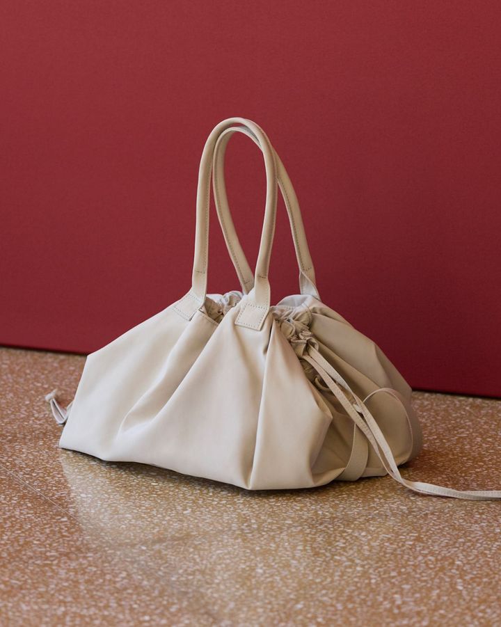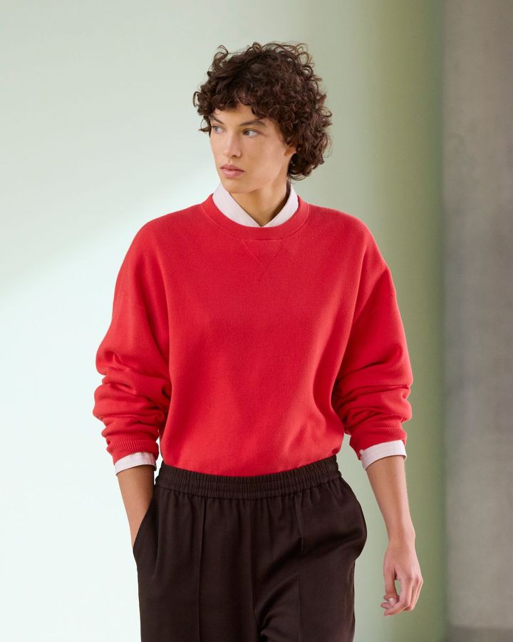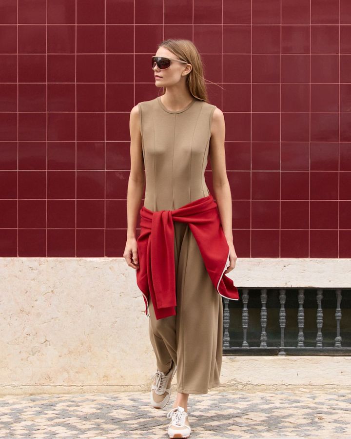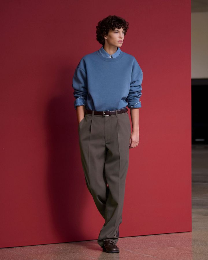 2026年春夏コレクションは、軽やかさもキーワードだ。パウダーライラックやスカイブルーの柔らかな色合いを軸に、心躍るカラーパレットを展開。トーンを揃えたテーラードアイテムは、鮮やかなレッドのニットと合わせコントラストを演出。ボリュームスリーブドレスは、バックルベルトのディテールがアクセントになっている。また、サテン素材のセットアップやミラノリブニット、ビスコースのニットTシャツなど、春夏スタイルに心地よさをもたらすファブリックにも注目を。