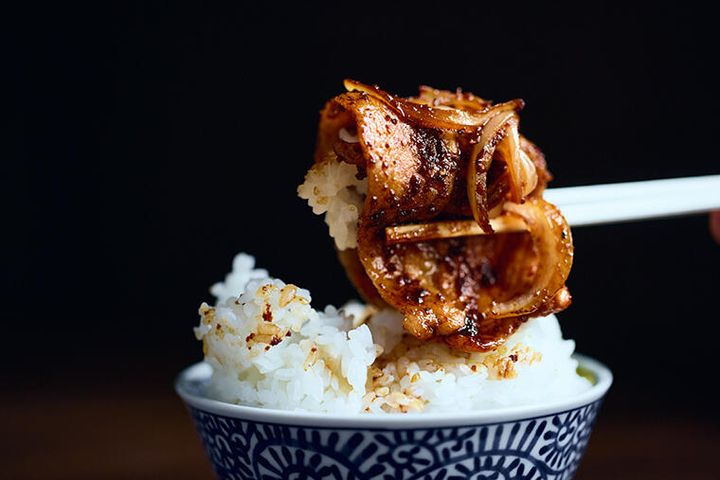 「小さい頃から家庭で親しんできた焼肉のタレの味を参考にした」そうで、立波さんによれば、その焼肉のタレは岩手県では各家庭に必ずあると言われるほどメジャーなもの。りんごの甘酸っぱさとコクのある黒酢の酸味、そしてパンチの効いたにんにくの風味が豚の脂身と相まって旨さ倍増。ご飯にくるみ、肉飯スタイルで食せば、箸が進むこと請け合いだ。