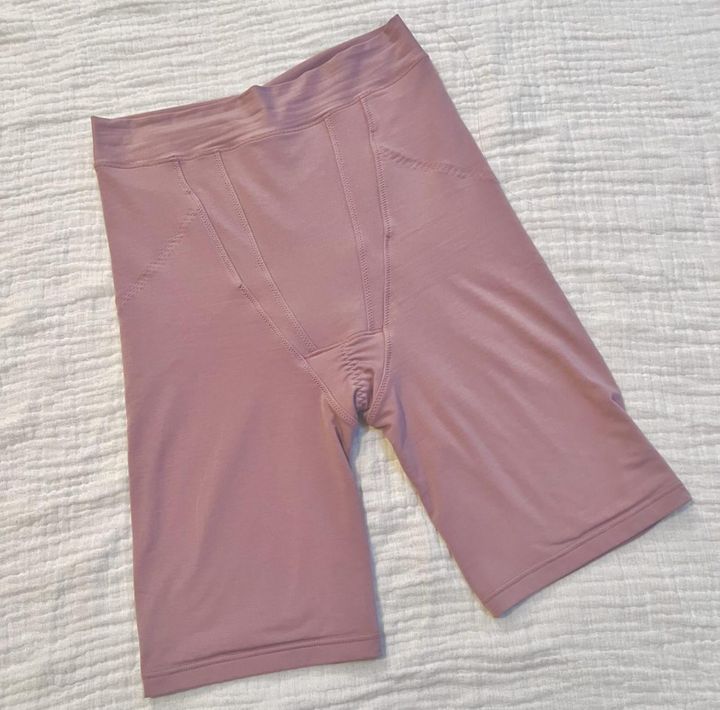 前面の様子。へそ下をしっかりと包むVの切り替え。恥骨下あたりにはグイッとテンションをかけてくれるギャザーが見えています。体型にもよると思いますが太ももとお尻まですっぽり包みこまれて安心感があります。