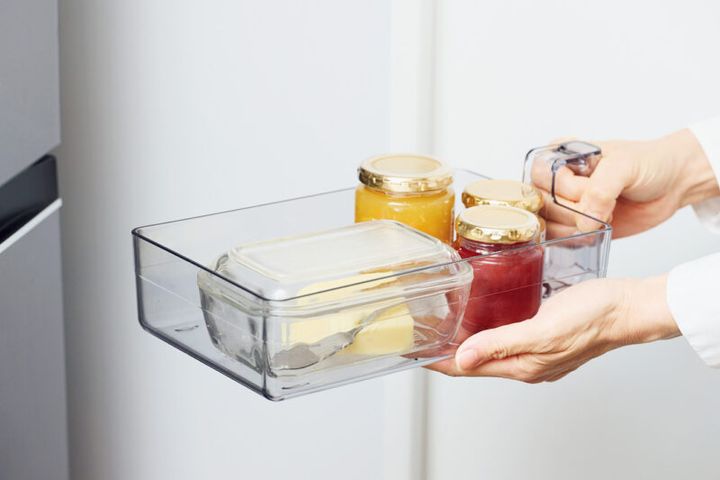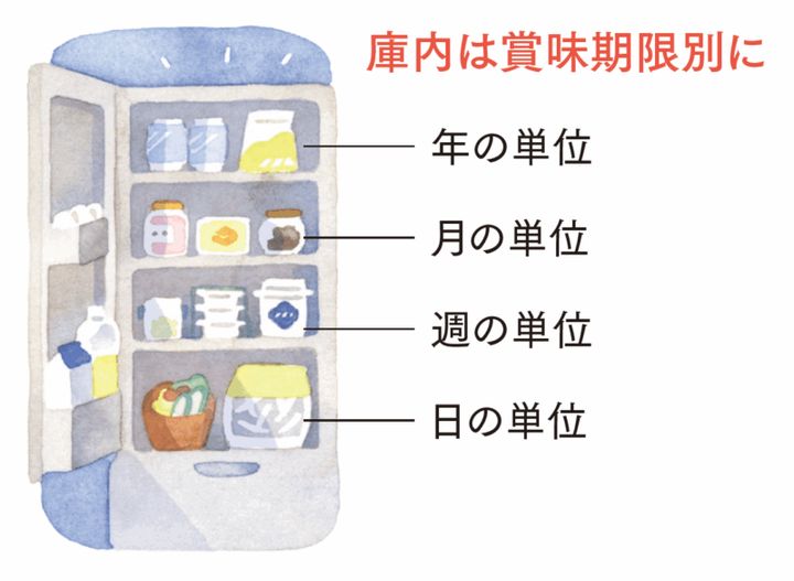 冷蔵庫は出し入れしやすい最下段に、賞味期限の短い昨日のおかずなどを、最上段には年単位で保存可能な缶飲料や粉ものなどをしまって。