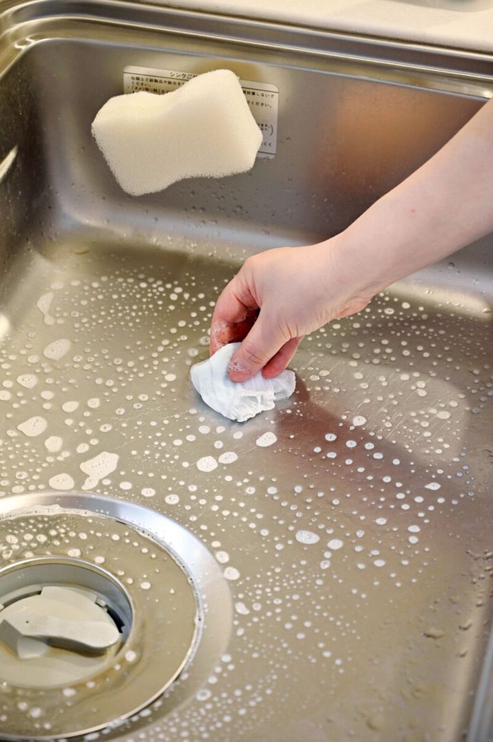 排水口にネットを取り付ける前に、ネットに食器用洗剤をつけてシンクをこすって。