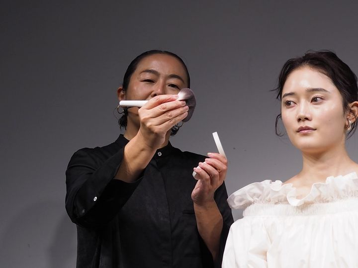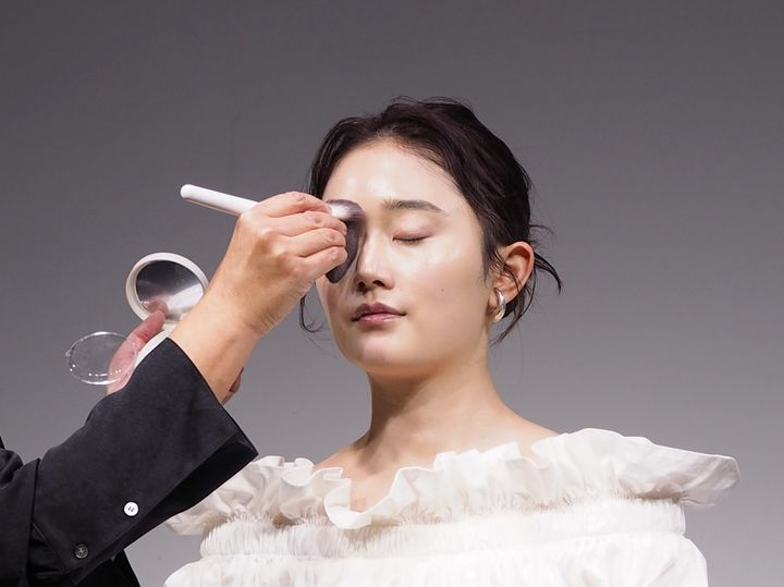 発表会では、人気ヘア&メイクアップアーティストの岡田知子さんによるメイクデモが行われ、新作アイテムを使ったこの春のツヤ肌の作り方を披露しました。