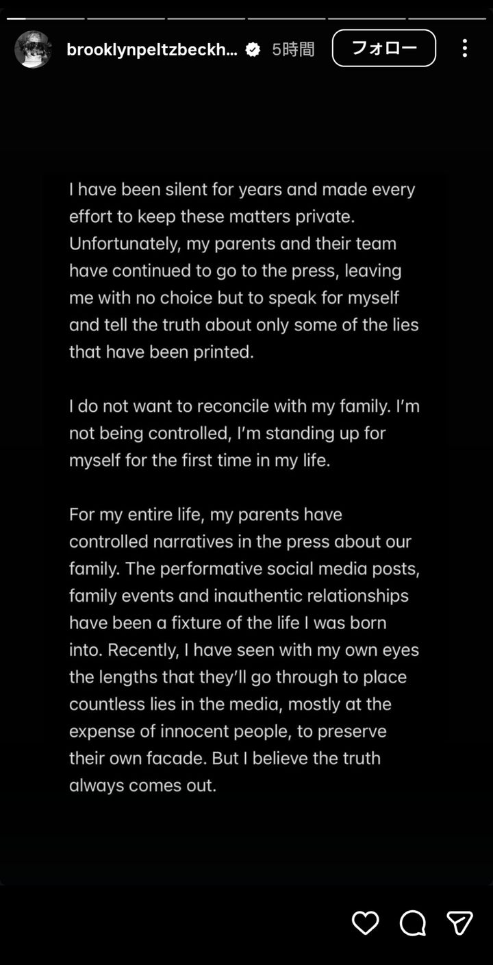 デヴィッド・ベッカムとヴィクトリア・ベッカムの長男ブルックリンが1月19日、インスタグラムのストーリーに長文でコメント。「両親は私たち家族についての報道をコントロールしてきた」とか、「家族と和解したくない」といった驚きの内容を明らかにした。