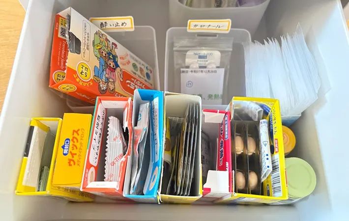 家族共用の市販薬、個人ごとの処方薬、湿布やばんそうこうなどの外用薬など、ざっくり分類しておくと、いざという時に必要な薬をサッと取り出すことができます。