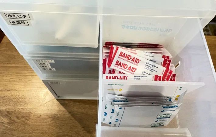 ばんそうこうはパッケージから出してバラして収納すると、使いたい時にすぐに使えて便利ですよ。