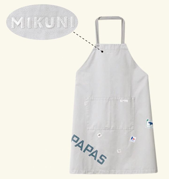 三國清三シェフとPapas(パパス)がコラボしたオリジナルエプロンが発売中です。素材はじょうぶでしっかりとした上質な中厚手コットンを使用。サイズは男女兼用のワンサイズですが、大人MからLLサイズくらいまで着用OK。胸元にさりげなく「MIKUNI」の刺繍が入っているのがポイント。裾にはPapasのワッペンつきです。カラーはネイビー、ライトグレー、カーキの3色。料理好きな方へのプレゼントにも最適です。