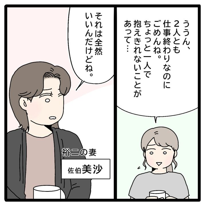 口を開けば「聡子」という正志さんに、もはや以前の面影はありません。すっかり変わってしまった夫の姿を前に、理恵さんは話し合うことすら諦めてしまいました。実質的に家族はもう破綻していますが、それでも黙って見過ごすことはできません。真相を知るため、理恵さんは正志さんの幼なじみである裕二さんと、その妻美沙さんに助けを求めたのですね。果たして2人の口から何が語られるのでしょうか。