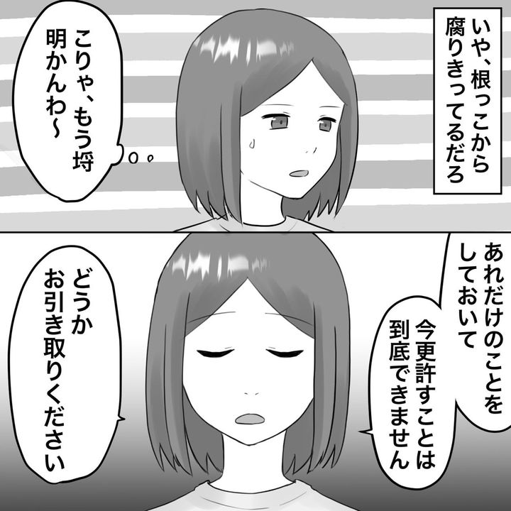 示談金として持ってきた30万円は、夫が暴れて実家の物を壊したり壁に穴を開けた件に関するものだというが、みちこの母は「壊されたのは目に見えるものだけではない」と跳ねのけた。