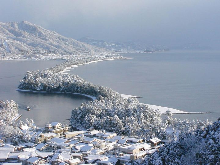 天橋立は波によって運ばれた砂が堆積した全長約3.6キロの砂嘴(さし)に、約6700本の松が生い茂る奇観。見る方向で風情が違いますが、天橋立ビューランド側からは龍が舞い上がる姿にたとえられます。特に、雪が積もった冬の景色は幻の風景として人気。