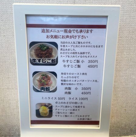 こちらは追加メニューです。席についてからも注文可能なのは嬉しいポイント。 牛骨スープでホロホロになるまで煮込んだ「牛すじご飯」や、特製のオニオンバターソースをたっぷりのせた「肉飯」など、こちらもおいしそうです。