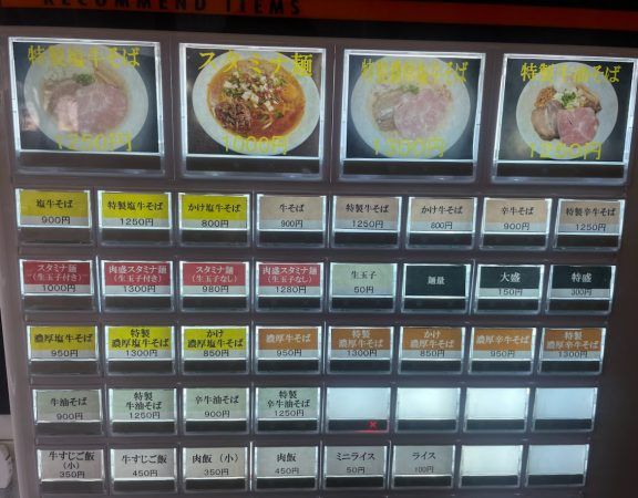 メニューは券売機から選びます。「塩牛そば」や「牛そば」、濃厚系などの多彩なバリエーションがズラリ! 定番を楽しみたい日や、ガッツリいきたい日など、その日の気分でいろいろ楽しめそうです♪